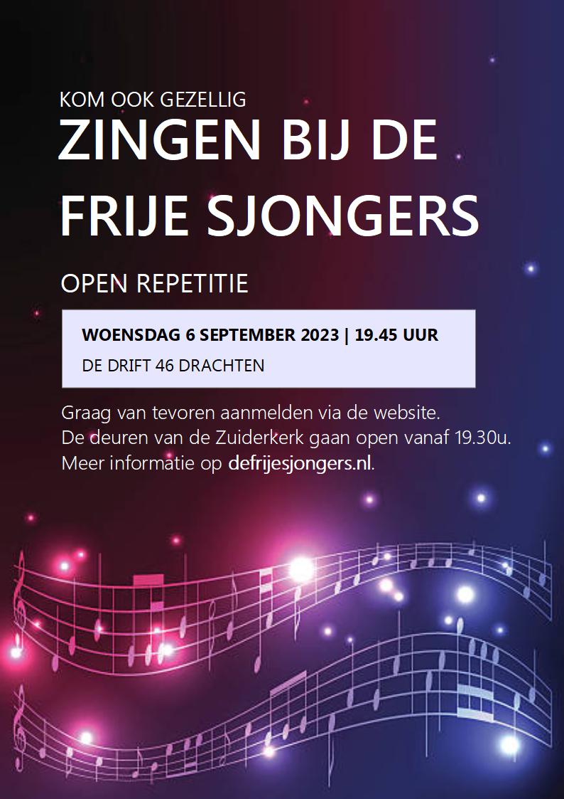 Ons gemengde koor De Frije Sjongers repeteert wekelijks op de woensdagavonden. We zingen een gevarieerd repertoire van klassiek tot moderne pop, met als doel een positieve boodschap over te brengen.