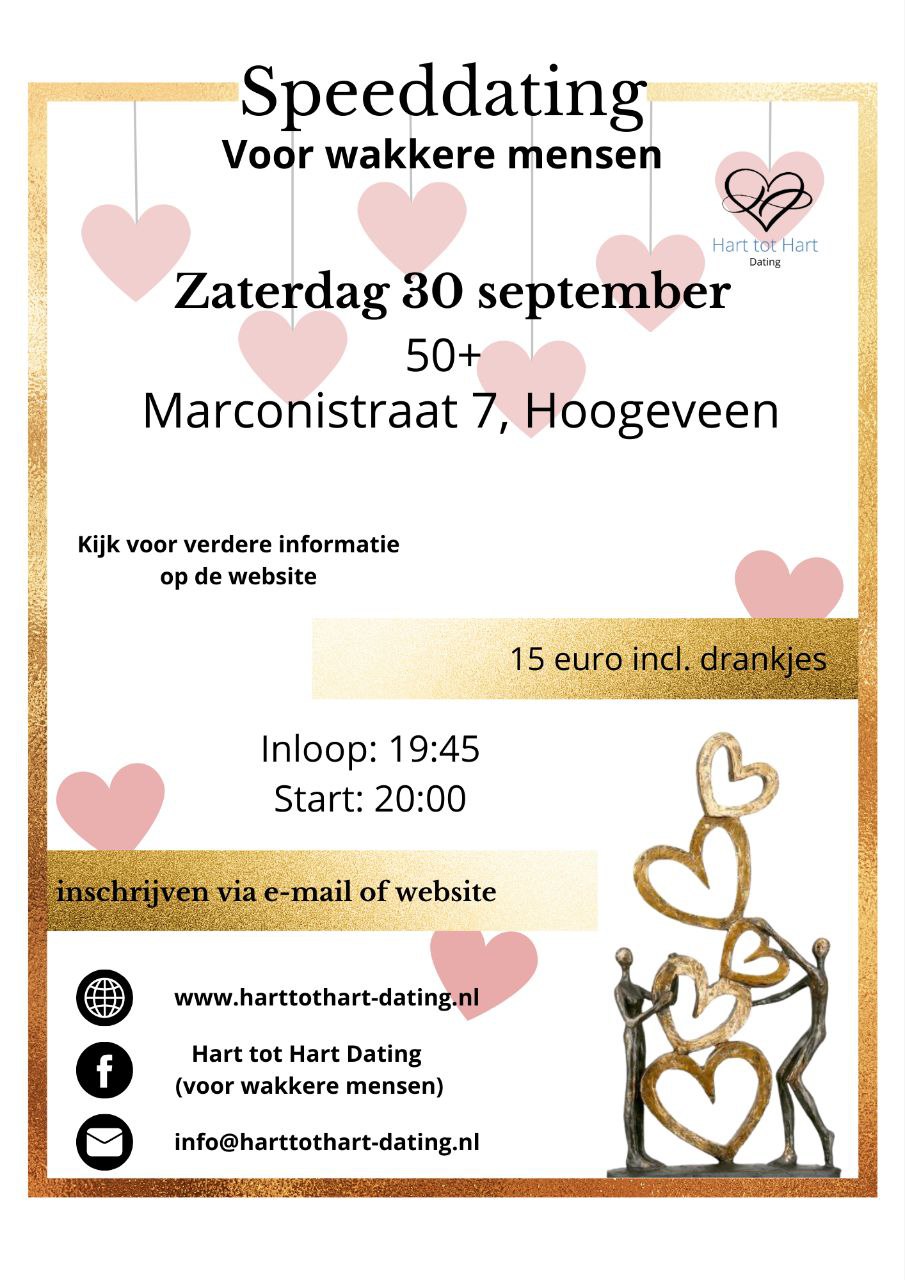 Voor meer informatie of inschrijven kijk op de website: https://www.harttothart-dating.nl/evenementen