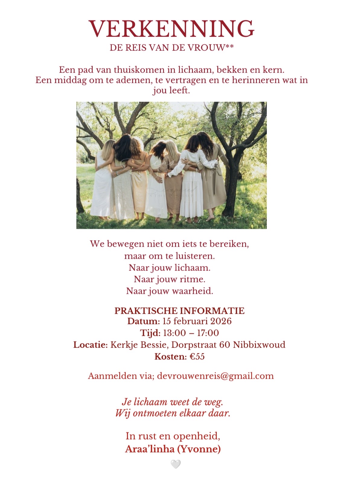 PS: Voel je een ja of heb je vragen,dan ben je welkom om te berichten via; devrouwenreis@gmail.com
